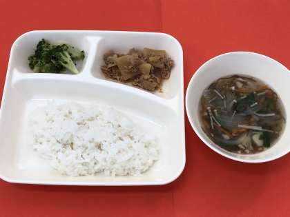今日の献立は、「豚肉のコチジャンいため」「もずくスープ」「ブロッコリーのナムル風あえもの」「ごはん」「牛乳」です。平成29年度の学校給食献立コンクール最優秀賞をもとにした献立です。