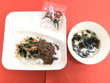 今日の献立は、「ビビンバ」「わかめスープ」「アーモンドフィッシュ」「牛乳」です。ビビンバは、肉と野菜が別々の配缶になっており、盛りつけたご飯に、肉の具、野菜の具をのせて各自で混ぜて食べます。旬のほうれん草、だいこんを使用し、彩りもきれいな子どもたちに好評な献立です。