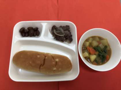 今日の献立は、「牛肉の香味焼き」「豚肉とだいこんのカレー煮」「うずら豆のグラッセ」「おさつパン」「牛乳」です。豆は、子どもたちに食べてほしい食材のひとつです。今回は、グラッセとして、バターの風味を効かせ食べやすく仕上げています。