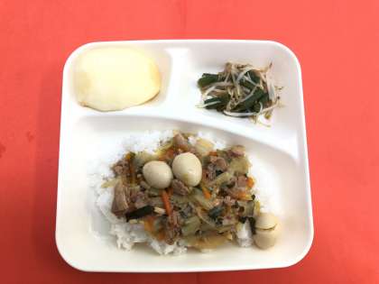 今日の献立は、「中華丼」「もやしの中華あえ」「りんご」「牛乳」です。とても好評でした。