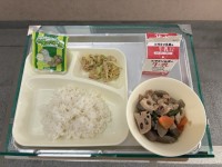 今日の献立は、「なまりぶしのしょうが煮」「みそ汁」「ほうれん草のごまあえ」「ごはん」「牛乳」です。なまりぶしは、かつおの身を蒸して干したものです。