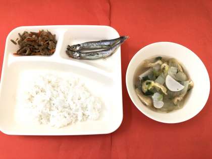今日の献立は、「焼きししゃも」「五目汁」「きんぴらごぼう」「ごはん」「牛乳」です。和食の献立も子どもたちには、とても好評です。