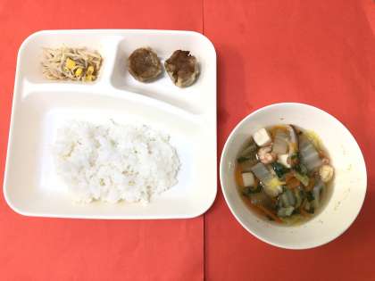 今日の献立は、「あげシューマイ」「えびととうふのスープ」「もやしとコーンのピリ辛あえ」「ごはん」「牛乳」です。あげシューマイは、子どもたちにとても人気があります。明日は、『カレーうどん』が登場します。
