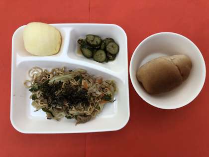 今日の献立は、「オイスターソース焼きそば」「きゅうりの中華あえ」「りんご」「黒糖クレセントロール」「牛乳」です。給食の焼きそばは、ソース味やしょうゆ味がありましたが、今回初めてテンメンジャンやオイスターソースを使用し、中華風に味つけした焼きそばが登場しました。
