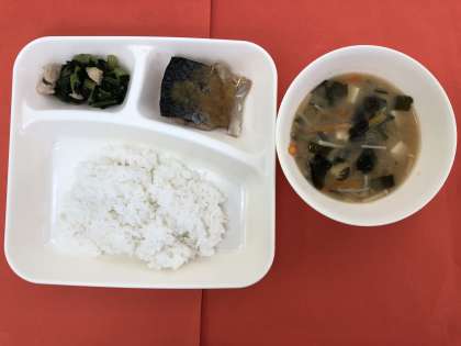 今日の献立は、「さばのみぞれかけ」「みそ汁」「こまつなの煮びたし」「ごはん」「牛乳」です。こまつなは、鶏肉といっしょに煮びたしにして食べやすくしています。