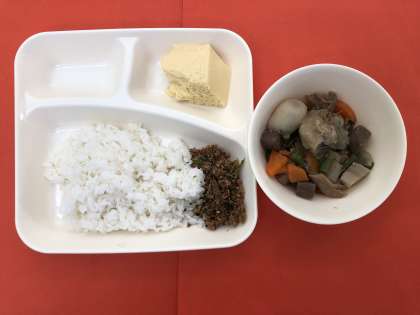 今日の献立は、「卵どうふ」「豚肉とさといもの煮もの」「おかかなっ葉」「ごはん」「牛乳」です。卵どうふは、卵にだしを加え、みりん、塩、しょうゆで味つけし、焼き物機で蒸しています。