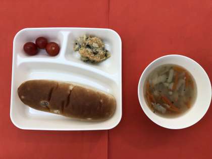 今日の献立は、「ほたて貝のグラタン」「だいこんのスープ」「プチトマト」「おさつパン」「牛乳」です。おさつパンはこどもたちに1番人気があるパンです。