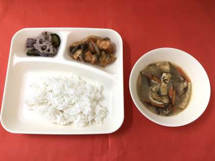 今日の献立は、「さけのなんばんづけ」「もずくのおみそ汁」「れんこんの赤じそあえ」「ごはん」「牛乳」です。