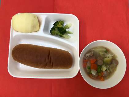 今日の献立は、「鶏肉と野菜の洋風煮」「ブロッコリーのサラダ」「りんご」「黒糖パン」「牛乳」です。ブロッコリーは花のつぼみの部分を食べる野菜です。かぜの予防によいとされるビタミンCが豊富です。