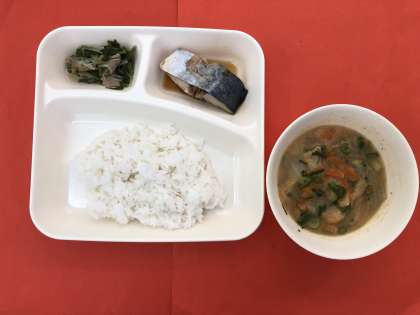 今日の献立は、「さごしのしょうゆだれかけ」「みそ汁」「みずなの煮びたし」「ごはん」「牛乳」です。みずなは、京都で古くから栽培されていた京野菜です。給食では年に1回、1月に登場します。
