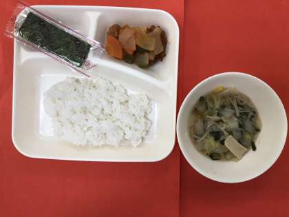 今日の献立は、「酢豚」「ワンタンの皮のスープ」「焼きのり」「ごはん」「牛乳」です。酢豚は、子どもたちに毎回好評な献立です。