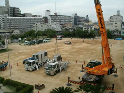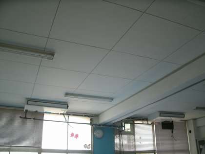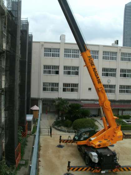 夏休みに入って、教室にエアコンを設置する工事を行っています。教室全てと習熟度別学習で使用する特別教室にエアコンがつきます。夏休み中に工事を済ませるために、土日も休まず、工事が進んでいます。今日(8月1日)は室外機を屋上に設置するため、クレーン車が入りました。各教室には室内機が2個ずつ取り付けられました。2学期からはエアコンのある教室で学習できます。