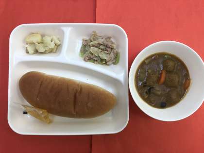 今日の献立は、「ミートボールと野菜のカレー煮」「ツナとキャベツのソテー」「焼きじゃが」「コッぺパン・マーマレード」「牛乳」です。カレー煮は、ボリュームのある煮込み料理です。明日は、かす汁が登場します。
