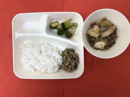 今日の献立は、「すき焼き煮」「ブロッコリーのしょうがづけ」「ツナっ葉いため」「ごはん」「牛乳」です。子どもたちに毎回好評なすき焼き煮です。今回も昨日から楽しみにしてくれていたようです。