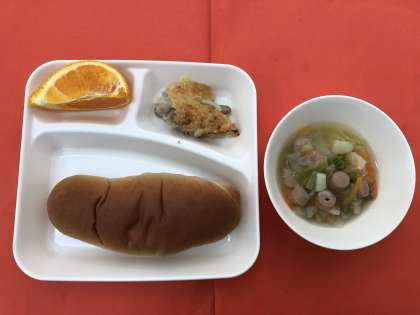 今日の献立は、「押し麦のグラタン」「スープ」「デコポン」「黒糖パン」「牛乳」です。食物せんいが多く含まれている押し麦を使用したホワイトソースのグラタンです。子どもたちにとても好評です。
