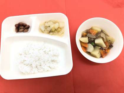 今日の献立は、「肉じゃが」「はくさいのゆず風味」「とら豆の煮もの」「ごはん」「牛乳」です。肉じゃがは子どもたちに人気の定番献立です。