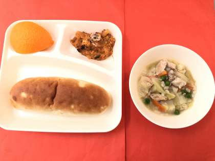 今日の献立は、「とうふのミートグラタン」「押し麦と野菜のスープ煮」「デコポン」「おさつパン」「牛乳」です。新食品の「大豆(粒状)」を使用したグラタンです。大豆(粒状)は、大豆が苦手な人にも食べやすいように加工された食品で、蒸してやわらかくした大豆をすりつぶし、乾燥させたものです。
