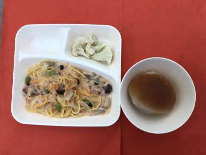 今日の献立は、「さけのクリームスパゲッティ」「カリフラワーのサラダ」「黒糖クレセントロールパン」「牛乳」です。ベーコンの旨みを生かし、手作りのホワイトルウ、牛乳、クリームを使用した紅ざけの淡い色がきれいなクリームスパゲッティです。