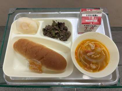 牛肉の香味焼き、トマトのスープスパゲッティ、なし(二十世紀)、