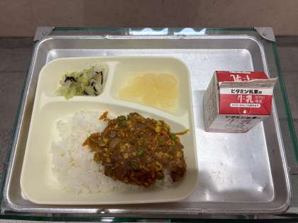 大豆入りキーマカレーライス、キャベツのひじきドレッシング、和なし(カット缶)、牛乳です。