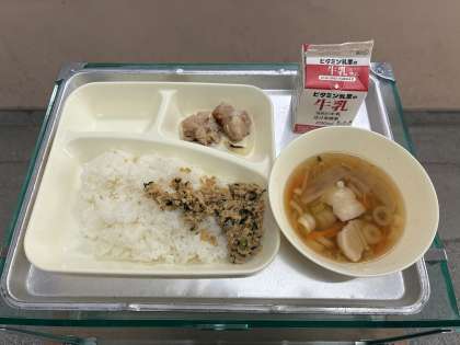 鶏肉のゆず塩焼き、ソーキ汁、ツナ大豆そぼろ、ご飯、牛乳です。