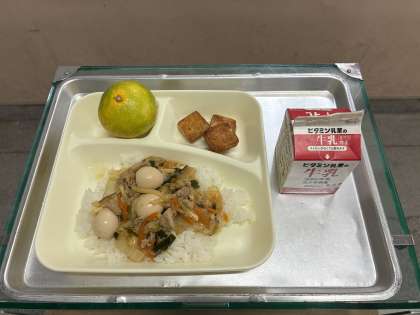 中華丼、あつあげの中華だれかけ、みかん、牛乳です。