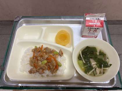 ピリ辛丼、中華スープ、白桃(缶)、牛乳です。