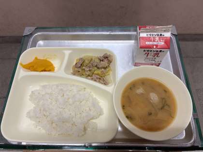 豚肉と野菜のいためもの、いわしのつみれ汁、かぼちゃういろう、ご飯、牛乳です。