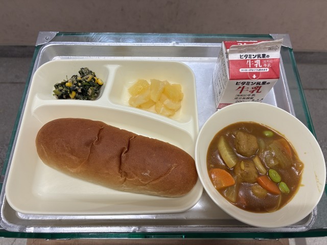 ミートボールと野菜のカレー煮・ツナとほうれんそうのソテー・パインアップル(カット缶)・黒糖パン・牛乳です。