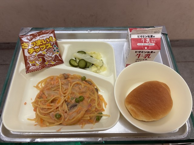 さけのスパゲッティ・キャベツときゅうりのサラダ・おさつチップス・ミニコッペパン・牛乳です。