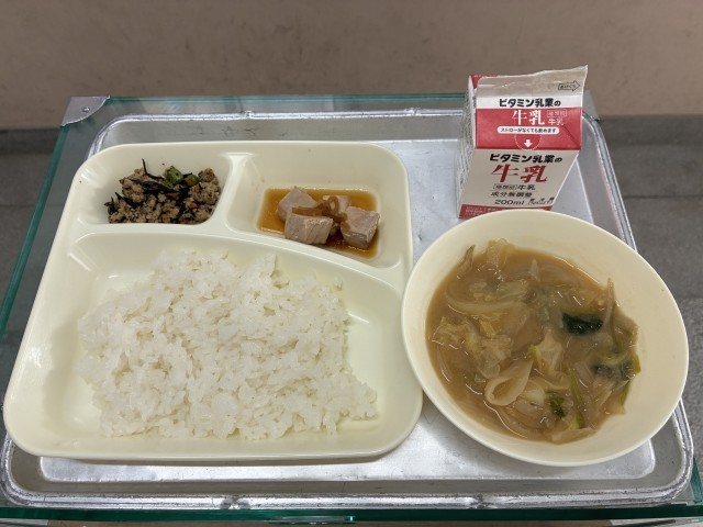 まぐろのねぎじょうゆかけ・みそ汁・高野どうふのいり煮・ごはん・牛乳です。