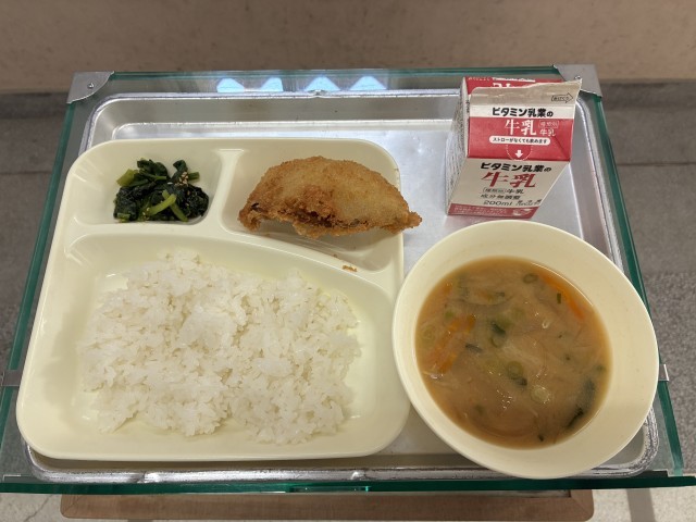 いわしのフライ・みそ汁・ほうれんそうのごまあえ・ごはん・牛乳です。