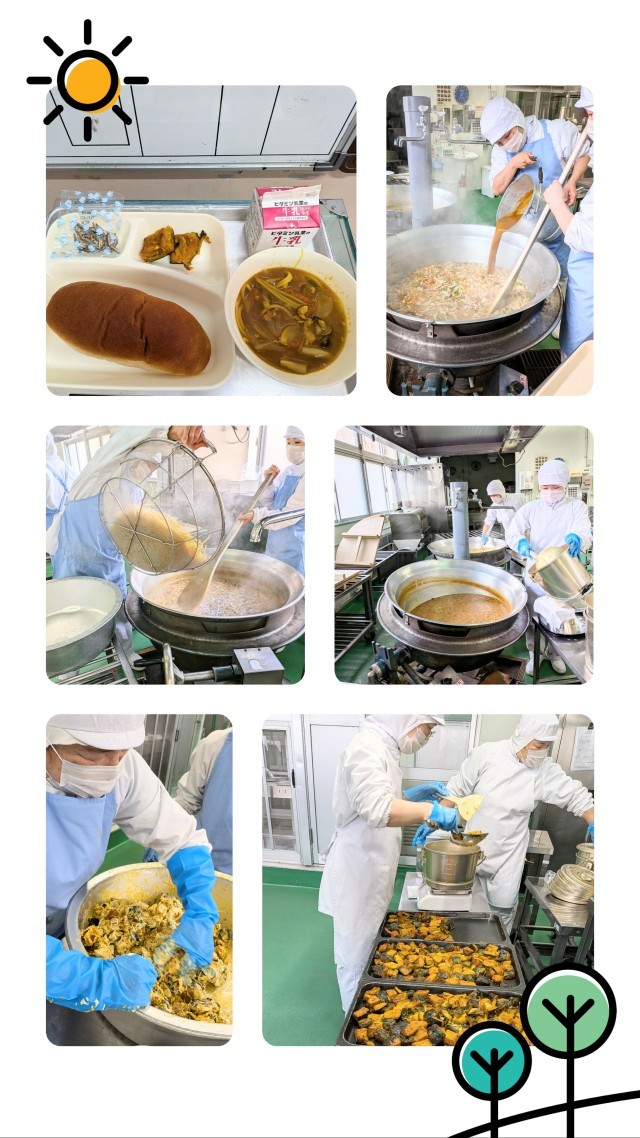 献立は、カレースープスパゲッティ・かぼちゃのマリネ焼き・ミニフィッシュ・黒糖パン・牛乳でした。