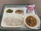 本日の給食は 鶏肉のカレー風味焼き・スープ煮・野菜のソテー・コッペパン・マーガ...