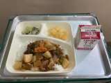 本日の給食は ハヤシライス・キャベツのひじきドレッシング・白桃(カット缶)・牛...