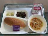 本日の給食は もずくと豚ひき肉のジューシー・さつまいものみそ汁・焼きれんこん・...