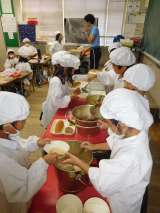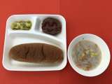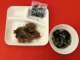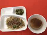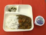 今日の献立は、「チキンカレーライス(米粉)」「野菜のピクルス」「ぶどうゼリー」「...