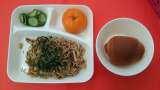 今日の献立は、「焼きそば」「あっさりきゅうり」「冷凍みかん」「黒糖クレセントパ...