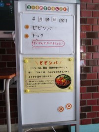今日の献立はビビンバ、トックです。おいしそう!前年度の給食委員会の児童が最後のお...