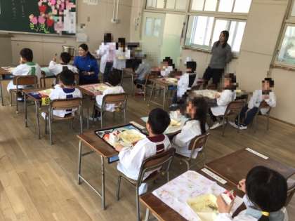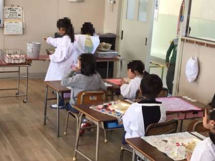 今日は1年生の初めての給食の時間です。6年生のお兄さんお姉さんに準備してもらって、いただきました。苦手な牛乳を飲んでる子、野菜を食べてる子、デザートのおだんごに苦戦している子とみんなが頑張って食べました。完食して嬉しい顔を見せてくれました。