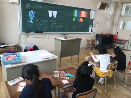 2年生は、図工で美味しそうなジュースつくりです。パスでしっかり塗り込み、きれいに仕上げています。