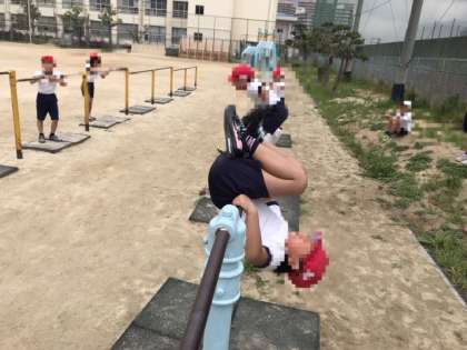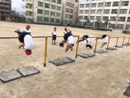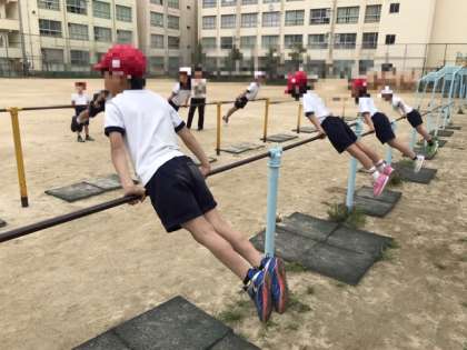 3年生の鉄棒の授業です。鉄棒の技の基礎となる、「つばめ」「おふとんほし」「前回りおり」をしていました。どの子も上手にできていたので、これから難しい技にも挑戦できますね。