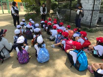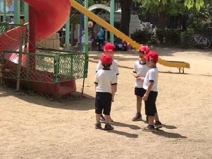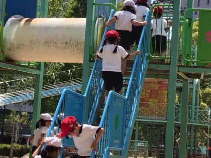 目的の公園に到着しました。荷物を木陰に置いて、滑り台や遊具で仲良く遊びます。