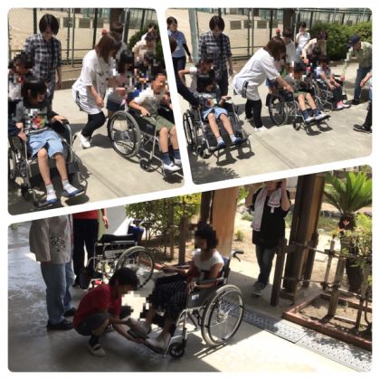 車椅子体験では、段差を越えたり、エレベーターに乗ったり、スロープを上り下りしたりします。恐いと言っている子が多く、介助の苦労を知りました。座っている子も、恐さや、車椅子生活の大変さを感じていました。