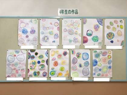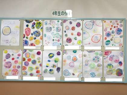 水彩絵の具の透明感がよく出ている作品です。シャボン玉の中にたくさんの色を見つけたのでしょうね。