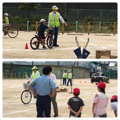 3.4年生の交通安全教室は、自転車の正しいのりかたです。教室で学習した後に、運動場で自転車に乗って実際に通り方を実習します。テストもあるのでみんながんばっています。