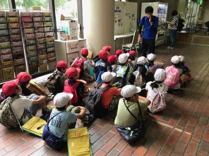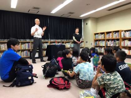 今日は、3年生が社会見学で港図書館に来ました。はじめにインドネシアのお話「イノシシとカエル」を聞かせていただきました。
