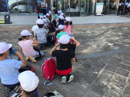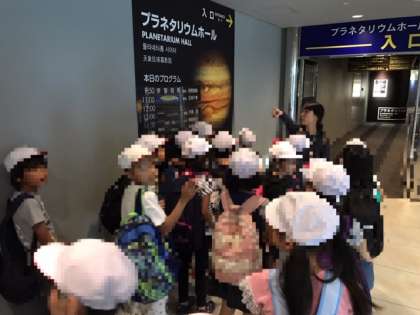 4年生は社会見学で大阪市立科学館に来ました。初めにプラネタリウム見学です。理科で学習した星座が見られるかな。
