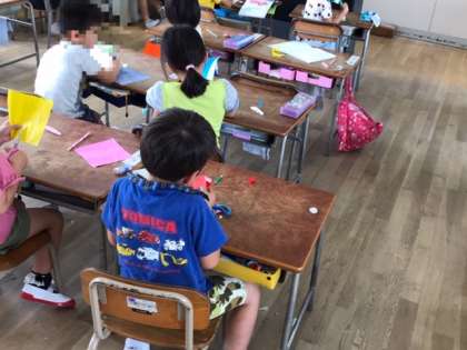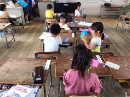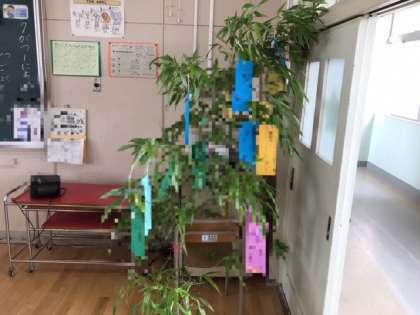 1年生が笹飾りを作っていました。色紙を折ったり切ったりしながら作っていました。完成が楽しみです。