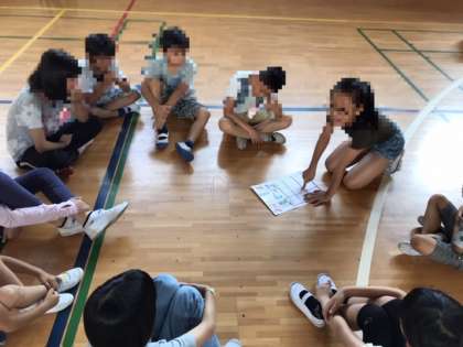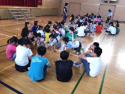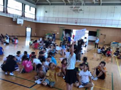 今日の児童集会は、夏ビンゴです。各縦割り班ごとに夏から連想できる言葉を書いて、ビンゴカードを作ります。集会委員の子が先生方にインタビュー形式で夏の言葉を集めます。夏休み、プール、花火、ビンゴになった班長はとても嬉しそうでした。